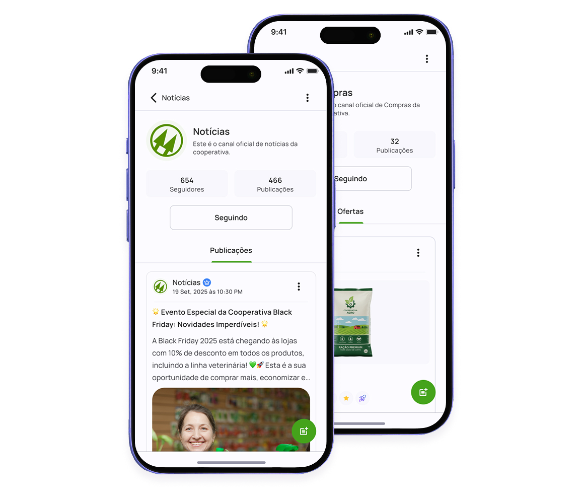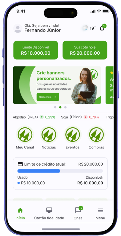 Centralize financeiro, assembleias, contratos, commodities e muito mais em um único app. 100% white-label, publicado nas lojas com o nome da sua cooperativa.