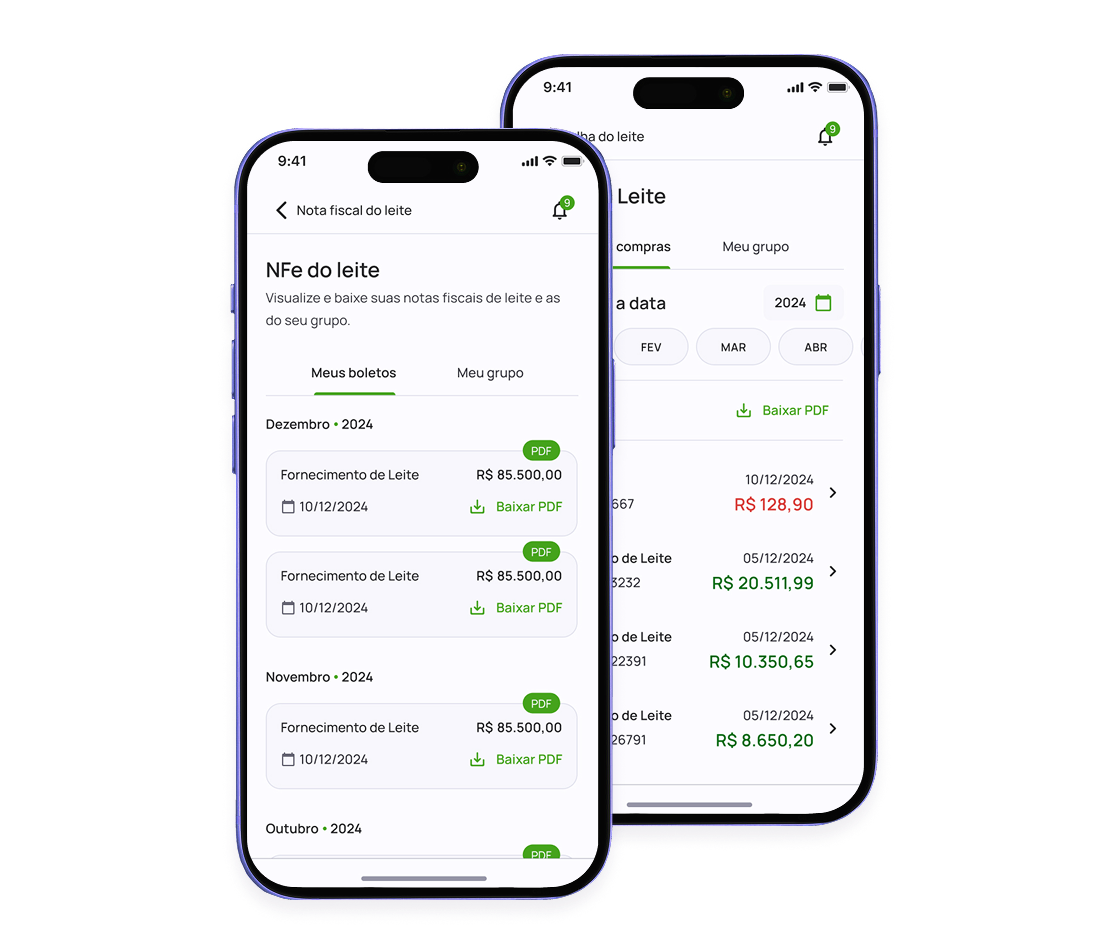 Funcionalidades específicas para acompanhamento de produção, notas fiscais e pagamentos de leite.